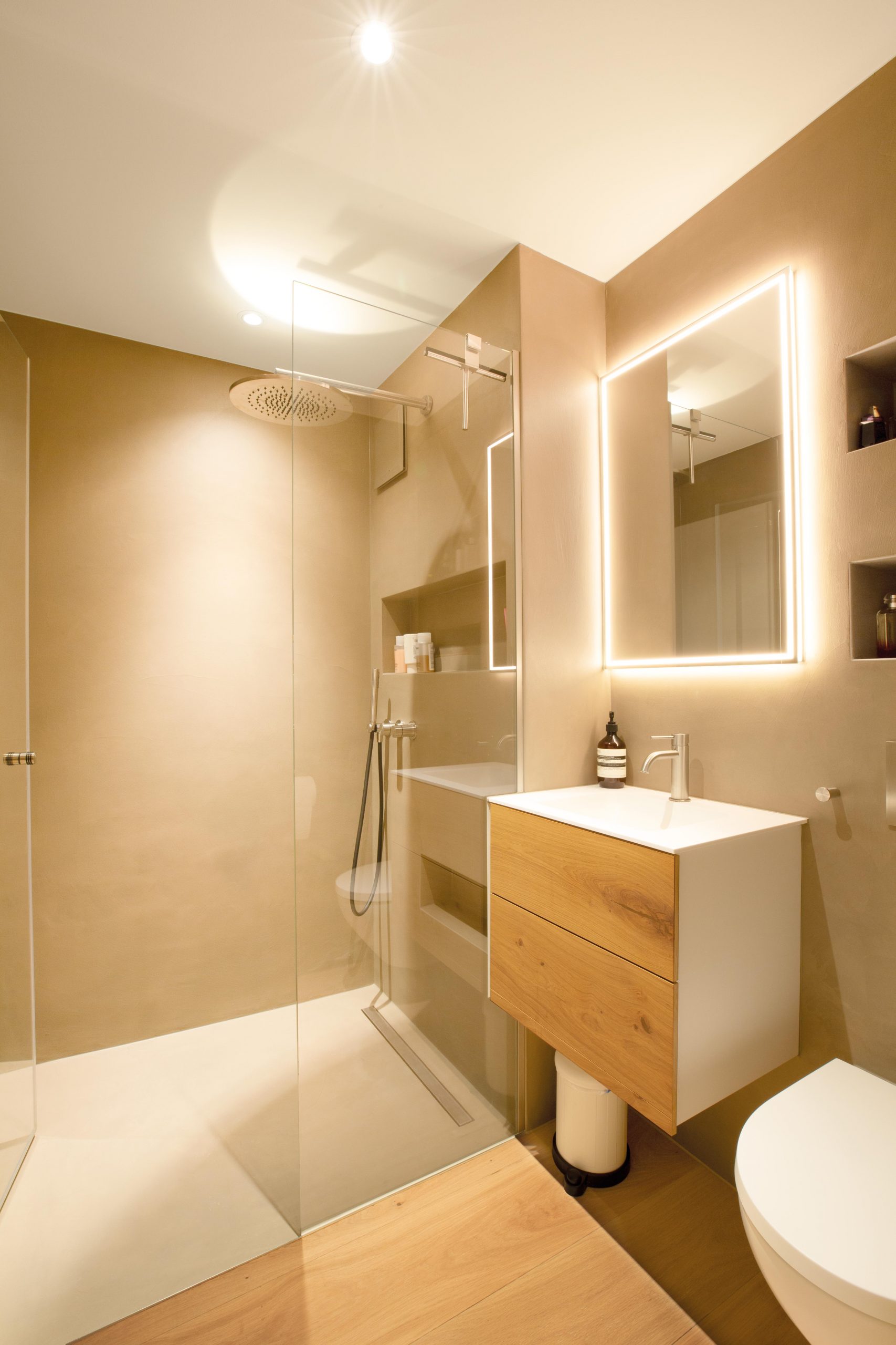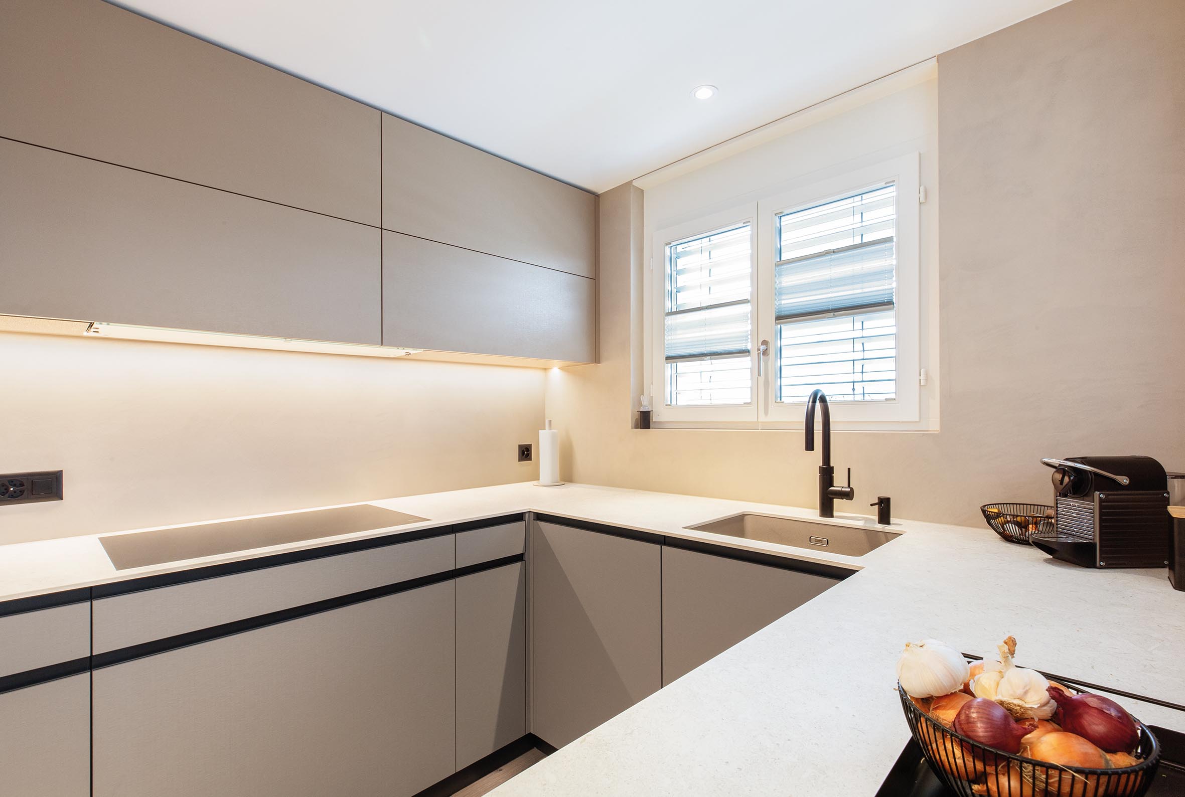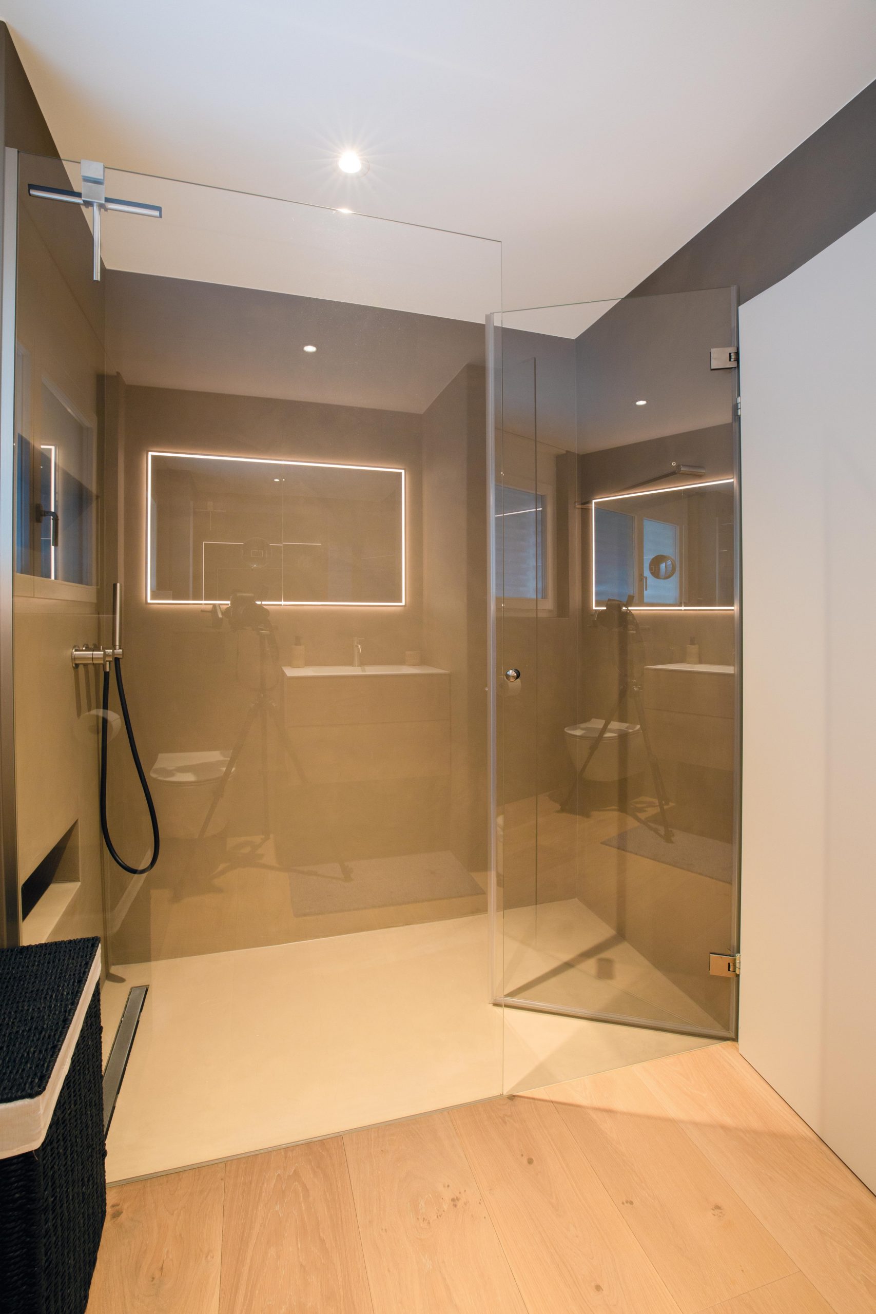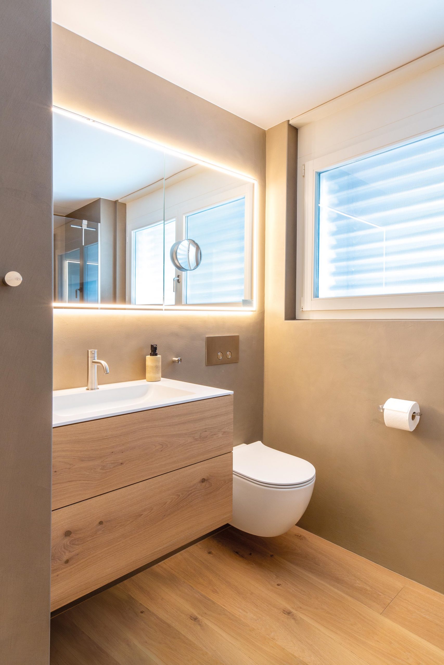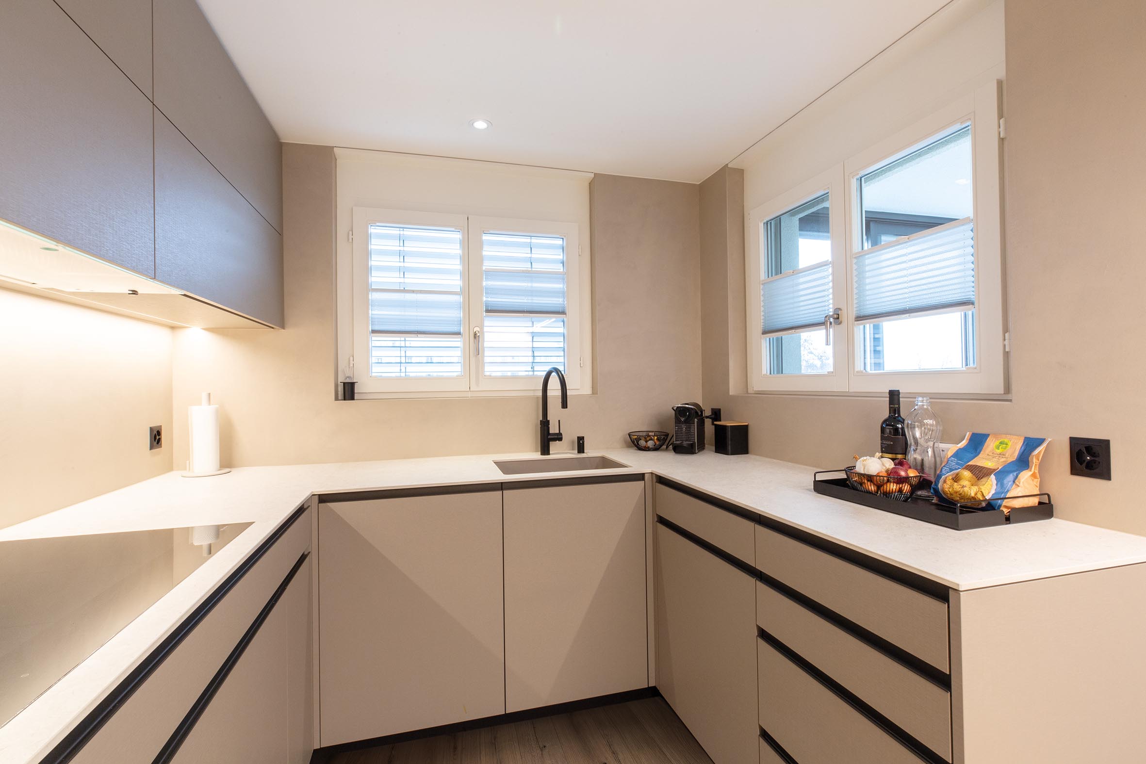 Im Wohnzimmer wurde neuer Putz aufgetragen, und die Küchenrückwand erhielt einen modernen Naturofloor-Wandbelag. Beide Bäder wurden ebenfalls mit Naturofloor gestaltet.
