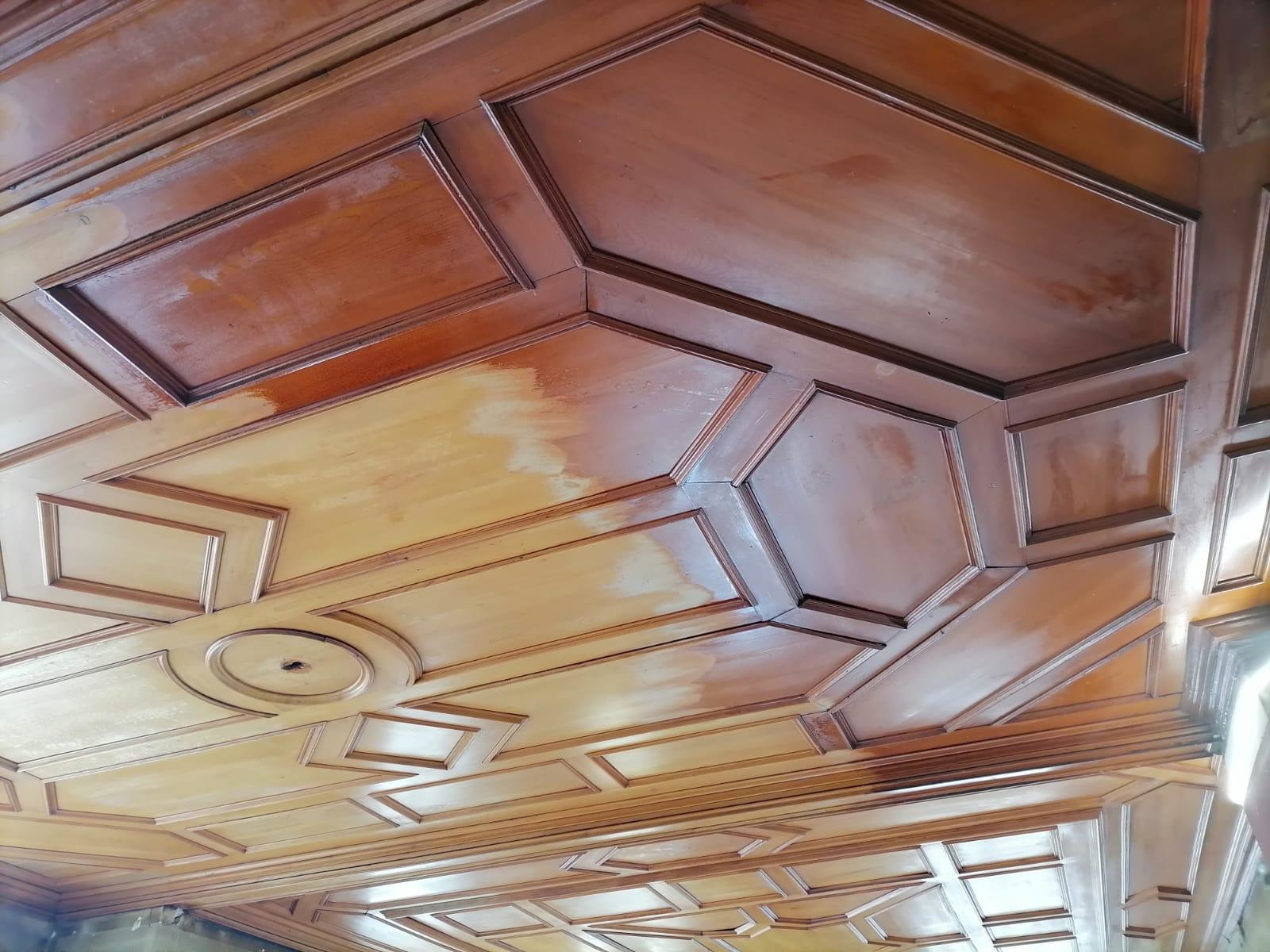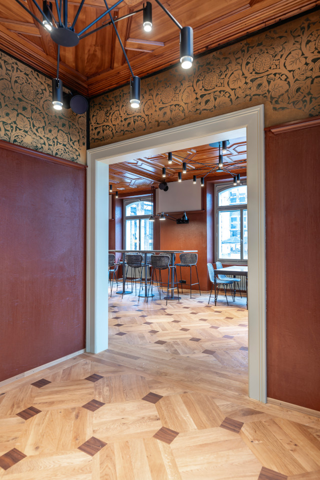 Türen, Bänke und Kassettendecken wurden sorgfältig vom alten Anstrich befreit und in mehreren Schritten mit traditionellen Ölfarben neu aufgebaut. Die Wände erhielten einen Anstrich mit Silikatfarbe, während das Holzwerk mit dem klassischen Pinseldurchzug (einer traditionellen Applikationstechnik) behandelt wurde.